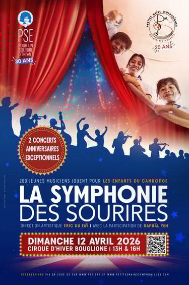 Le samedi 12 avril prochain à 13h et 16h, deux concerts symphoniques seront organisés au Cirque d'Hiver Bouglione pour célébrer respectivement les 20 ans de l’association Petites Mains Symphoniques (PMS) et les 30 ans de l’ONG Pour un Sourire d’Enfant (PSE).