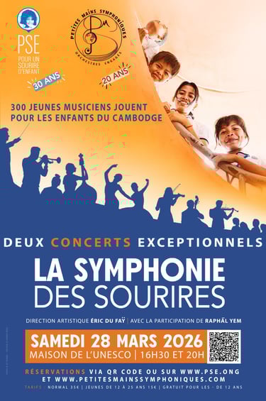Le samedi 28 mars prochain à 16h30 et à 20h, deux concerts symphoniques seront organisés à la Maison de l’UNESCO pour célébrer respectivement les 20 ans de l’association Petites Mains Symphoniques (PMS) et les 30 ans de l’ONG Pour un Sourire d’Enfant (PSE).